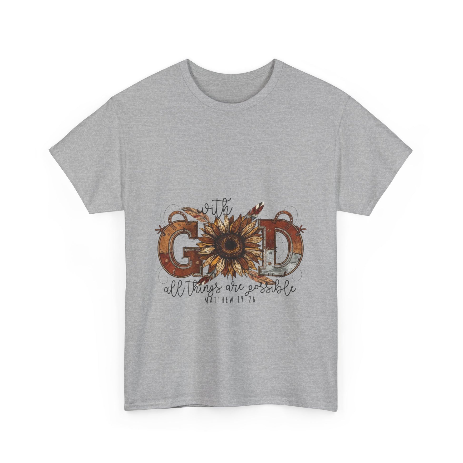 Soft, breathable cotton with a warm, faith-forward design that feels like a quiet Sunday sunrise. This tee places a rustic sunflower-and-wheat graphic centered over the chest, with the word “GOD” formed into an earthy, textured composition and a small, hand-lettered scripture line beneath. It sits with a relaxed, classic fit that layers easily under a cardigan or wears solo with jeans. The lightweight yet durable fabric holds print detail beautifully, and thoughtful construction — like shoulder twill tape and a ribbed, shape-retaining collar — keeps this shirt looking good wash after wash. Wear it to small group meetups, casual worship nights, or on mornings when you want a reminder of hope and grounding.