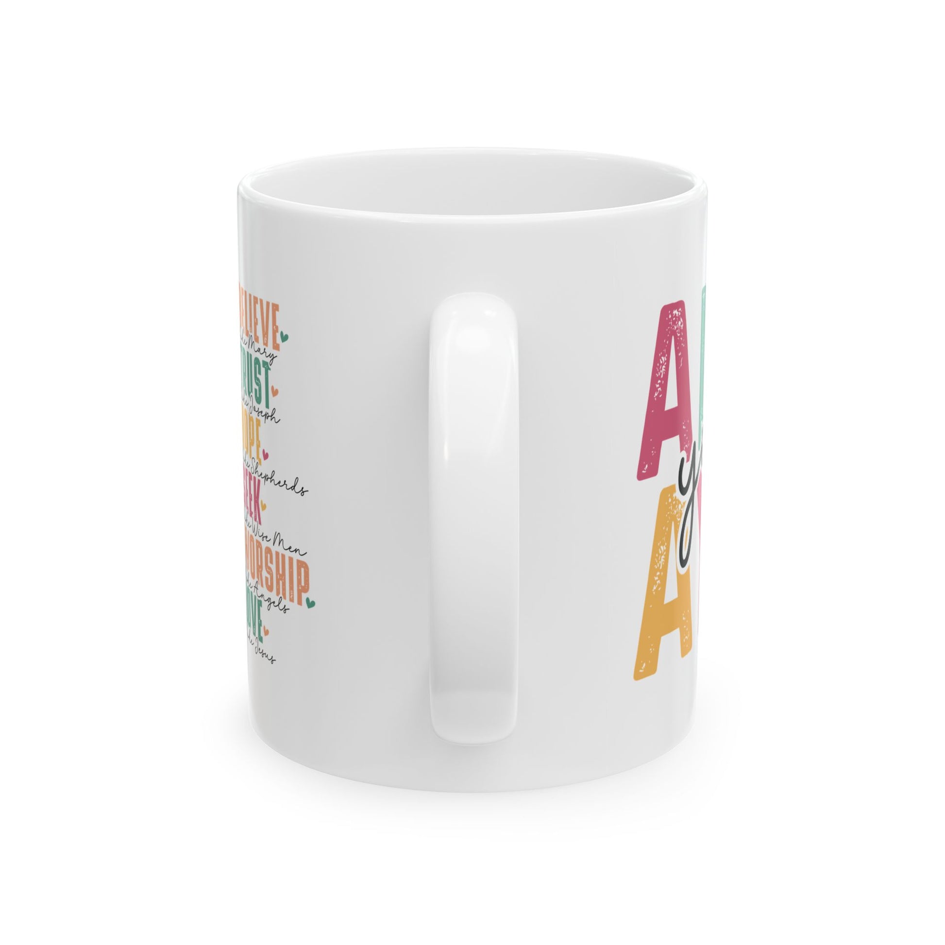 Start every morning with inspiration using this charming ceramic mug. Its glossy surface features vibrant, motivational designs that uplift your spirit with each sip. Perfect for your daily coffee, tea, or hot chocolate, this mug adds a pop of color and positivity to any kitchen or office space. It's an ideal gift for friends, family, or coworkers who appreciate a little encouragement in their day. Celebrate special occasions such as birthdays, holidays, or just because—this mug is perfect for those who value both style and substance. Bring joy and warmth to yourself or a loved one, making every drink a reminder to believe, trust, and seek joy.