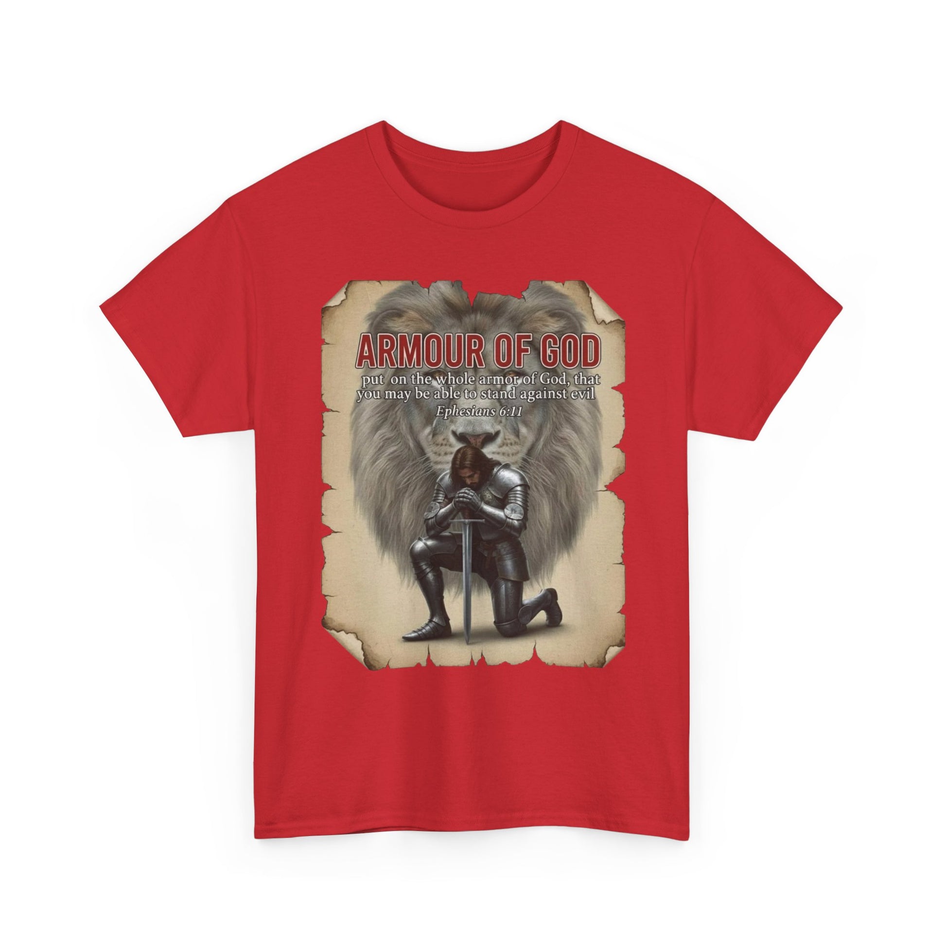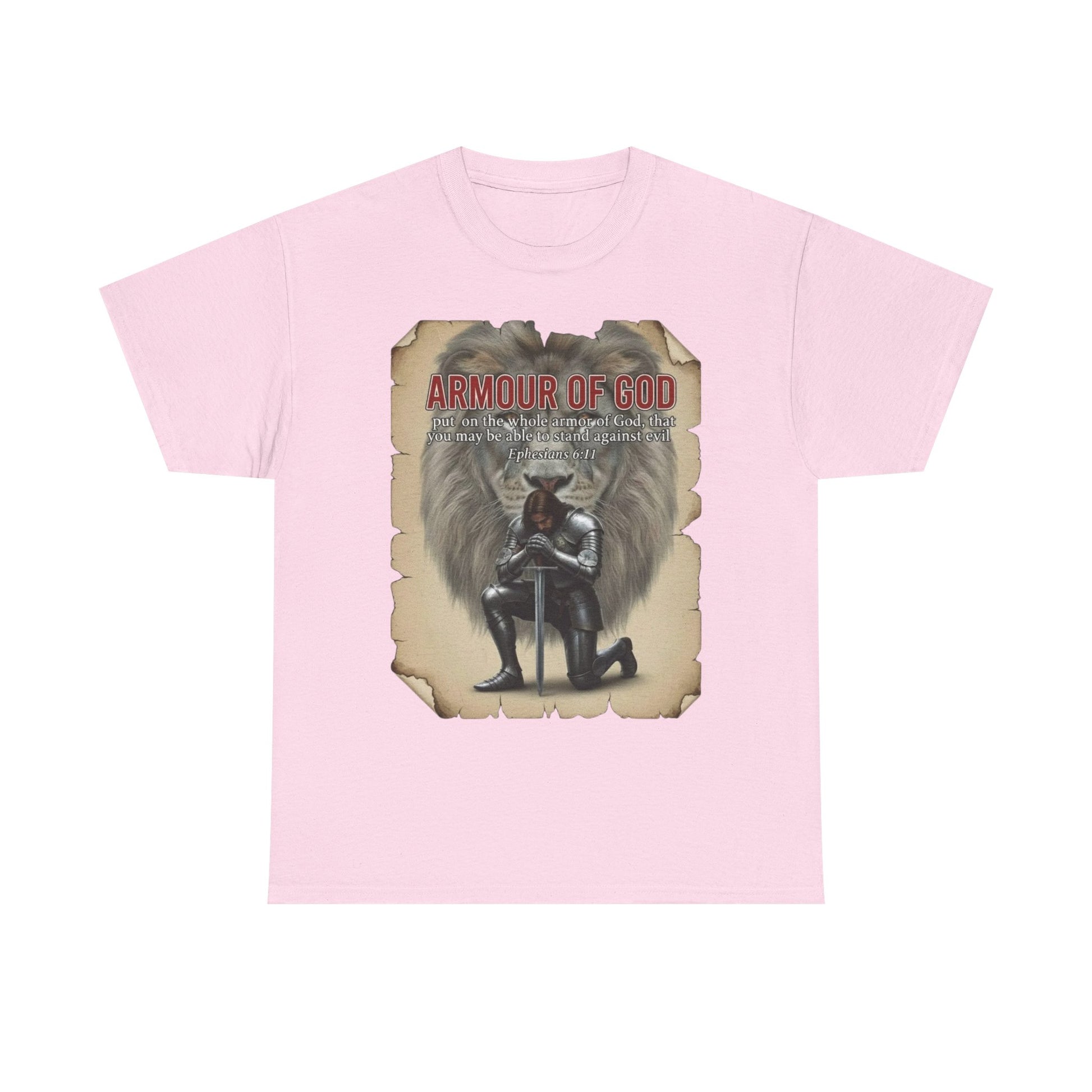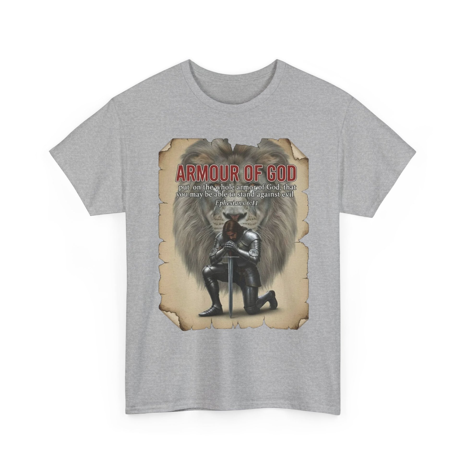 This classic cotton tee carries a quiet strength. A knight kneels in prayer before a subtle lion silhouette—the design whispers faith, courage, and steady protection. The muted parchment background and weathered edges give it a worn, storybook feel that settles into everyday wear. It pairs easily with jeans or a layered flannel for cool mornings, and its roomy, relaxed cut lets the message feel calm rather than loud. Wear it when you want a gentle reminder of resilience and faith during long days, small victories, or moments of reflection.