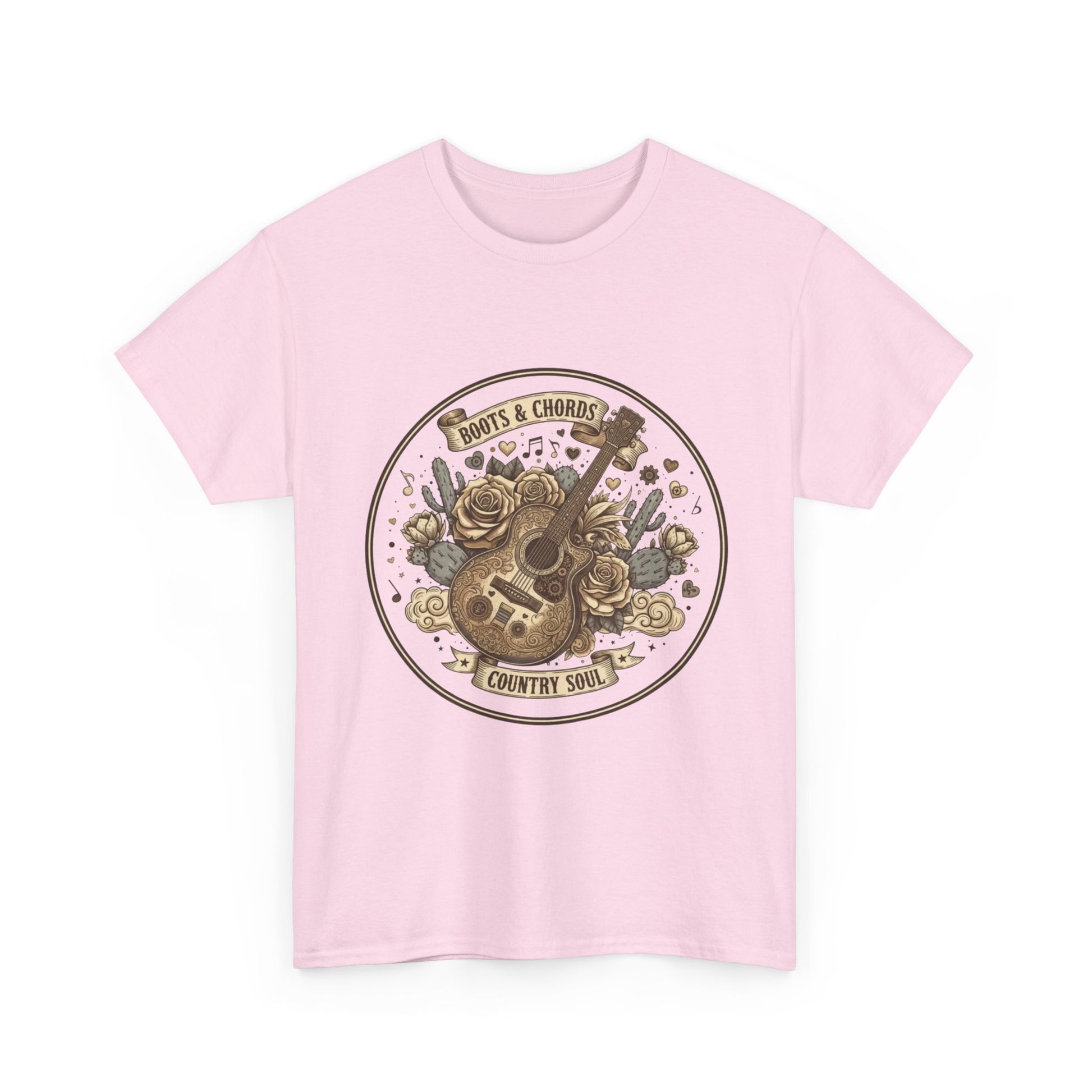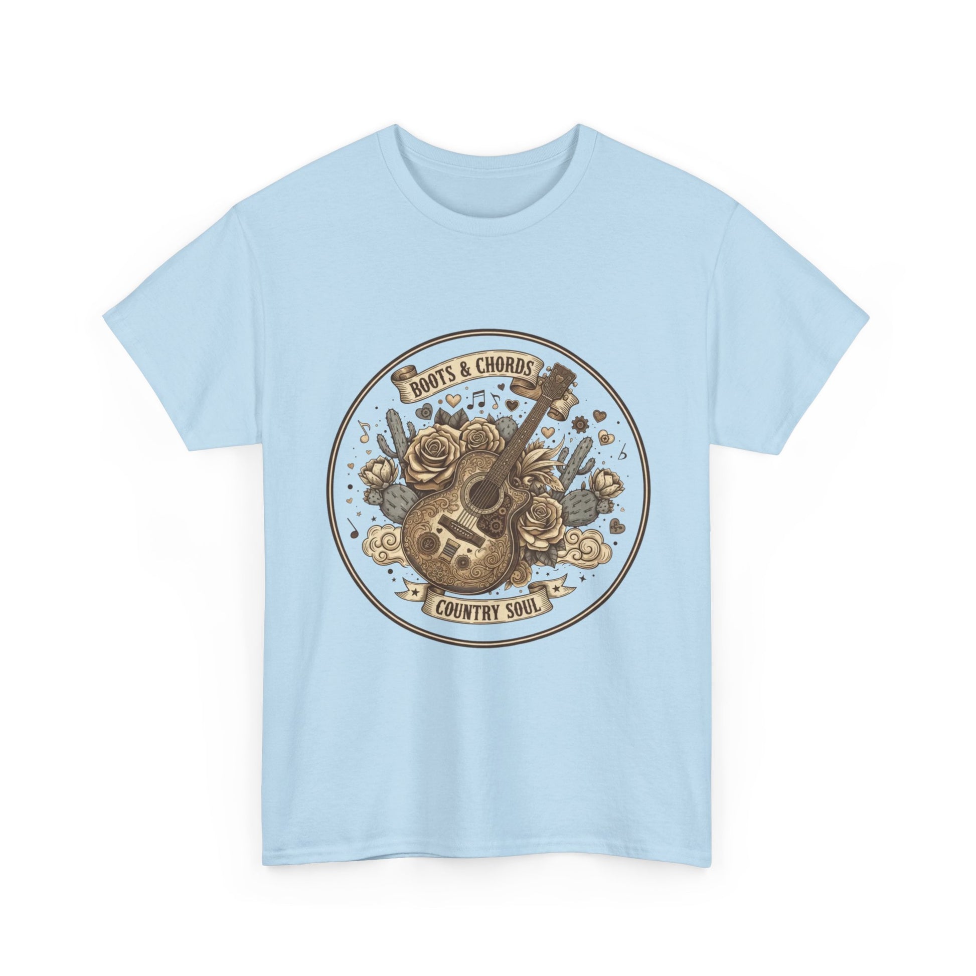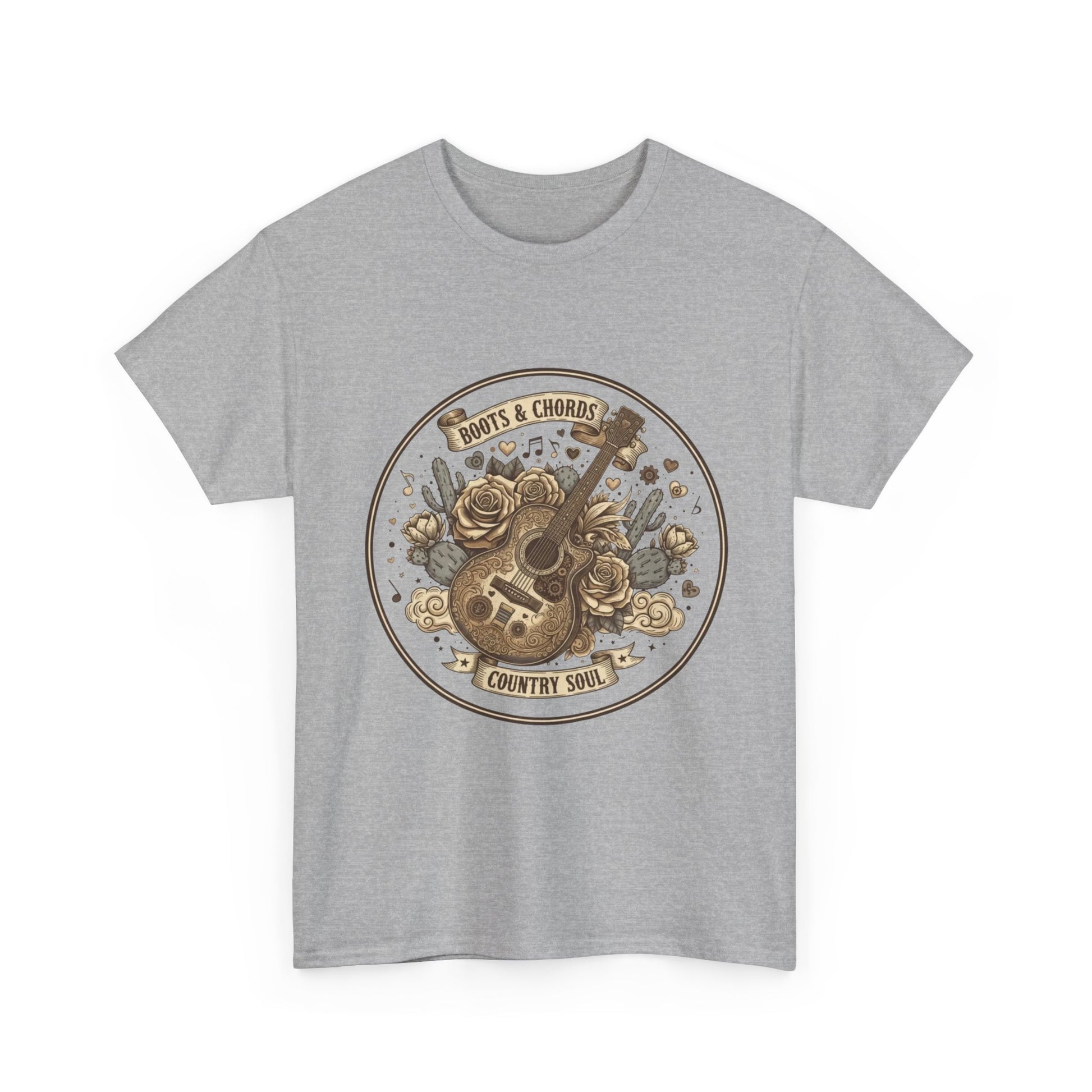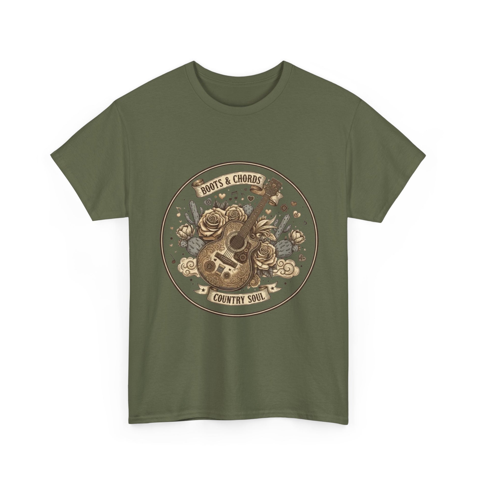 Find a quiet porch at dusk, a mason jar of cold tea in hand, and let this tee hum the soundtrack of worn-in chords and late-night stories. The front shows a weathered acoustic surrounded by roses and musical notes, rendered in warm sepia tones that age like a favorite record. It’s soft against the skin and keeps its shape after many spins through the wash — the kind of shirt you reach for when you want comfort and a little vintage soul. Wear it to open-mic nights, backyard jams, or while tuning up between road trips. It settles easily into a laid-back wardrobe and feels like a small, steady tribute to nights spent chasing melodies.