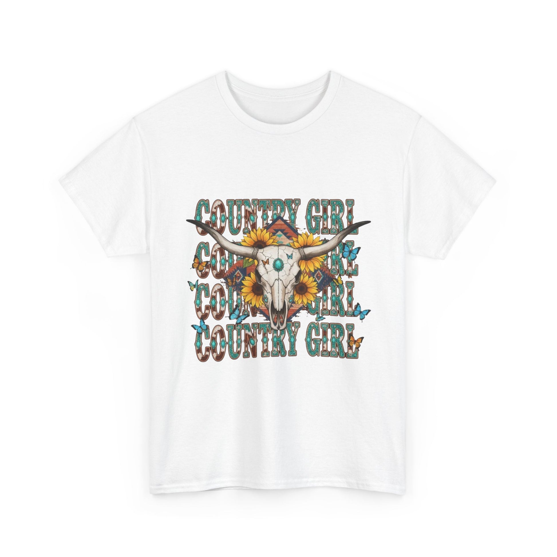Soft and slightly slouchy, this classic crew tee carries a bold western spirit. A sun-bleached skull sits front and center, framed by sunflowers and distressed turquoise lettering that reads "Country Girl." Wear it to slow mornings on the porch, dusty festival fields, or evenings around a backyard fire. The fit breathes and moves with you — roomy through the chest and shoulders, with a neat crew neckline that keeps the look grounded. The print has a lived-in, vintage vibe that pairs effortlessly with faded jeans, denim jackets, or a favorite flannel.