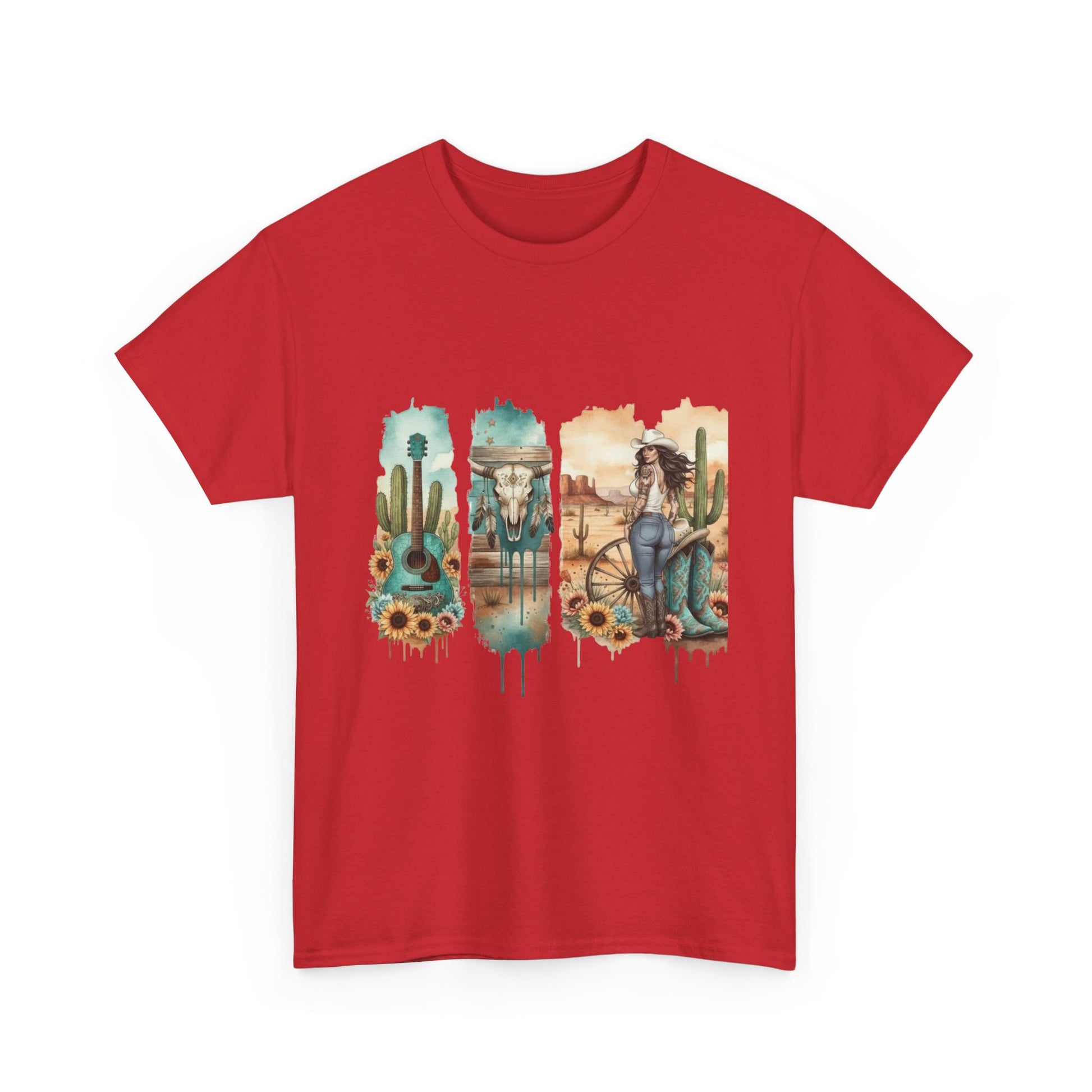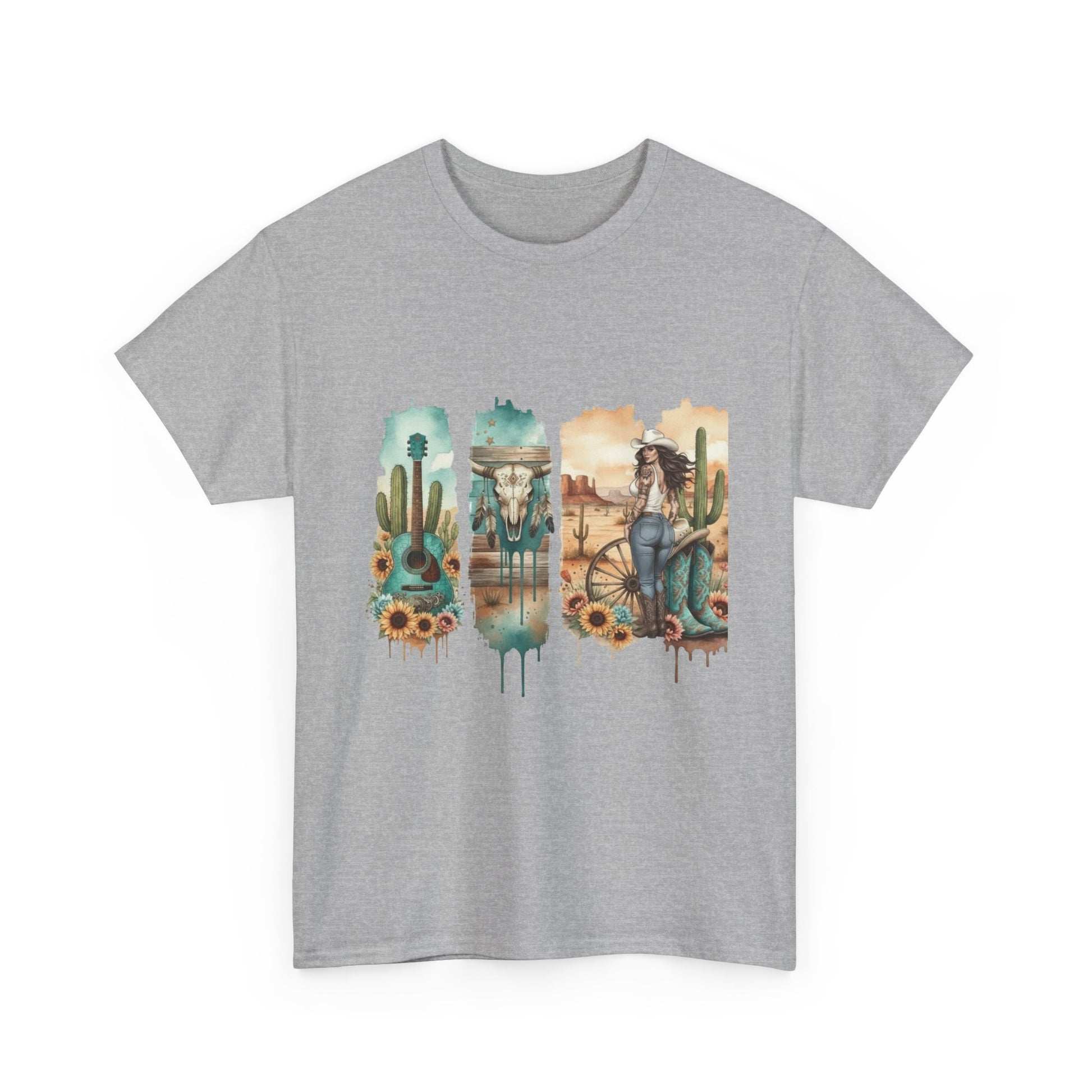 This lightweight cotton tee carries a warm, sun-soaked scene across the chest — three vertical watercolor vignettes that blend desert plants, sunflowers and relaxed, reflective figures into a gentle, painterly story. The soft white canvas lets the muted turquoise, ochre and terra tones breathe. Wear it on slow mornings with coffee, at outdoor markets, or layered under an open flannel for evening bonfires. The vibe is quietly nostalgic: easy silhouettes, natural fibers, and artwork that invites a second look and a conversation.