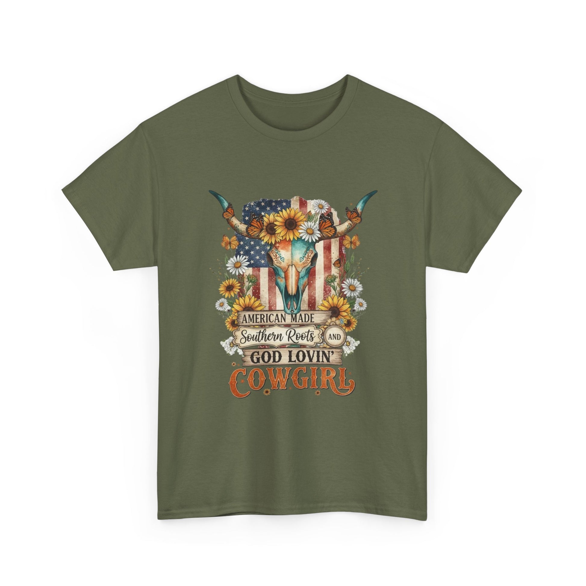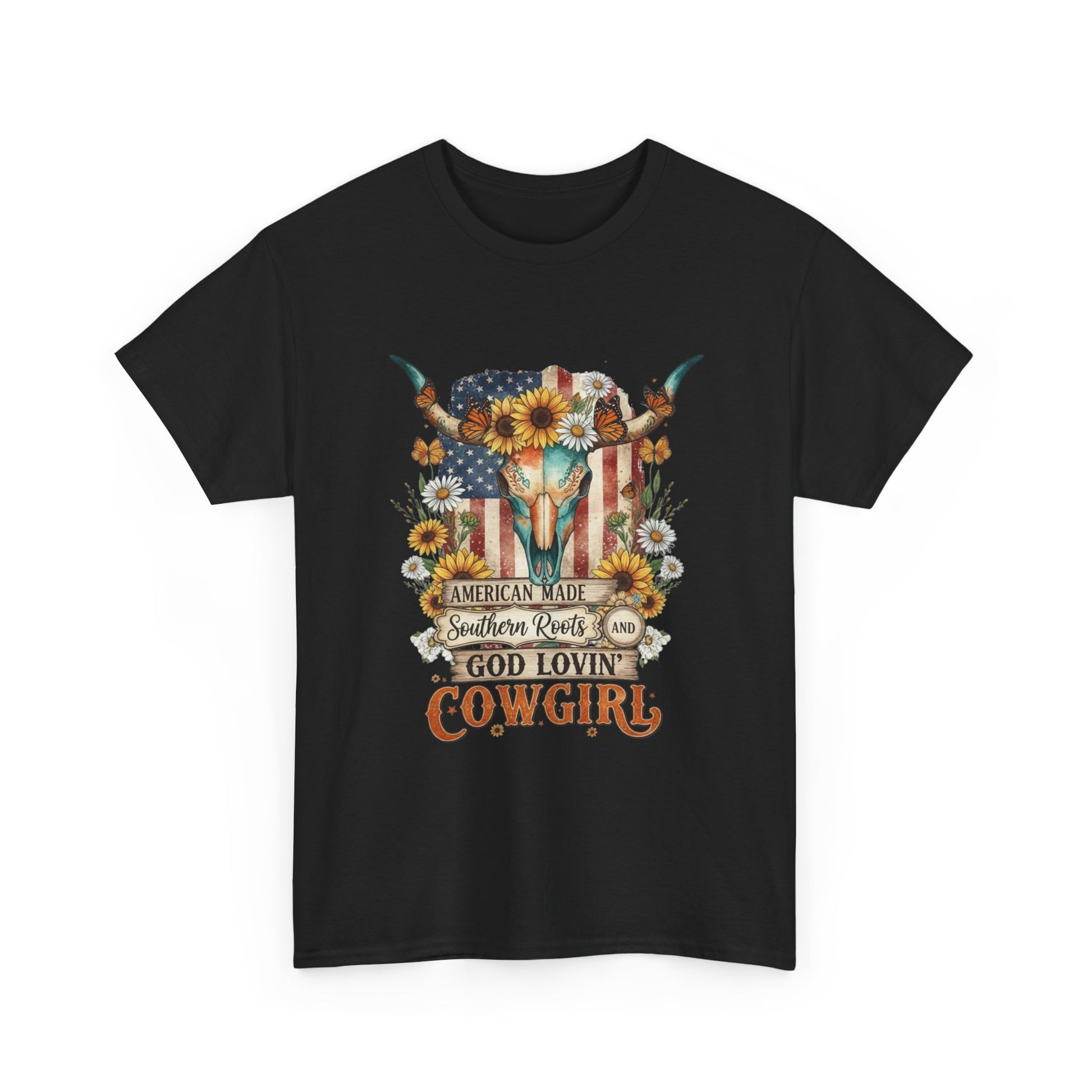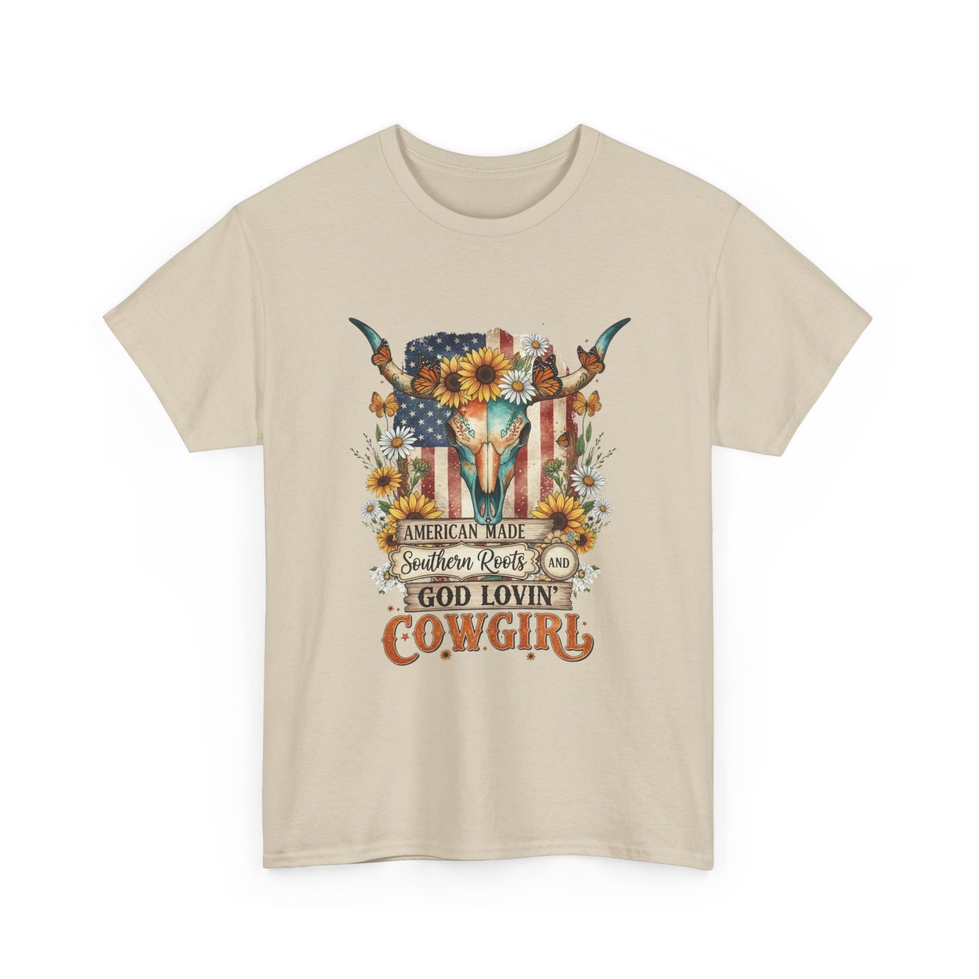 This classic cotton tee carries a sunlit, country spirit — a weathered American flag, wild sunflowers, cattle horns and hand-lettered text that reads like a roadside sign. It feels like a slow afternoon on a backroad: warm dust, the hum of crickets, and a faithful heart that loves faith, home, and boots worn in from honest work. The relaxed crew neck and midweight fabric sit comfortably under a denim jacket or alone on a hot day, while the durable print techniques keep the graphic vivid through washes. Wear it to barn dances, church picnics, or while sipping coffee on the porch — it blends everyday comfort with a proudly rustic, faith-forward statement.
