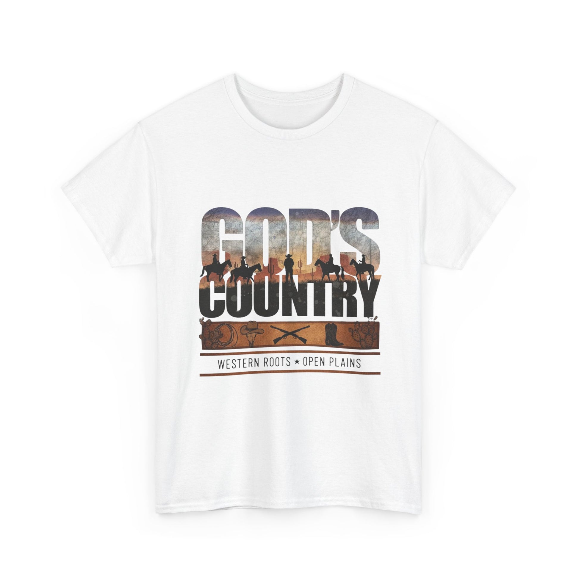 This short-sleeve tee carries a quiet, wide-open feel — soft, substantial cotton with a bold, landscape-filled graphic reading “GOD’S COUNTRY.” The print blends sunset tones and farmland silhouettes inside strong headline letters, balanced by a subtle bar and the words “WESTERN ROOTS • OPEN PLAINS.” Wear it on road trips at dusk, church parking lot hangouts, weekend ranch runs, or for slow afternoons on the porch. The classic crew neck and relaxed fit let the graphic do the talking while the sturdy midweight fabric holds its shape through washes. It sits comfortably between everyday wear and statement layer, echoing a slower, grounded life where wide skies and familiar rhythms matter.
