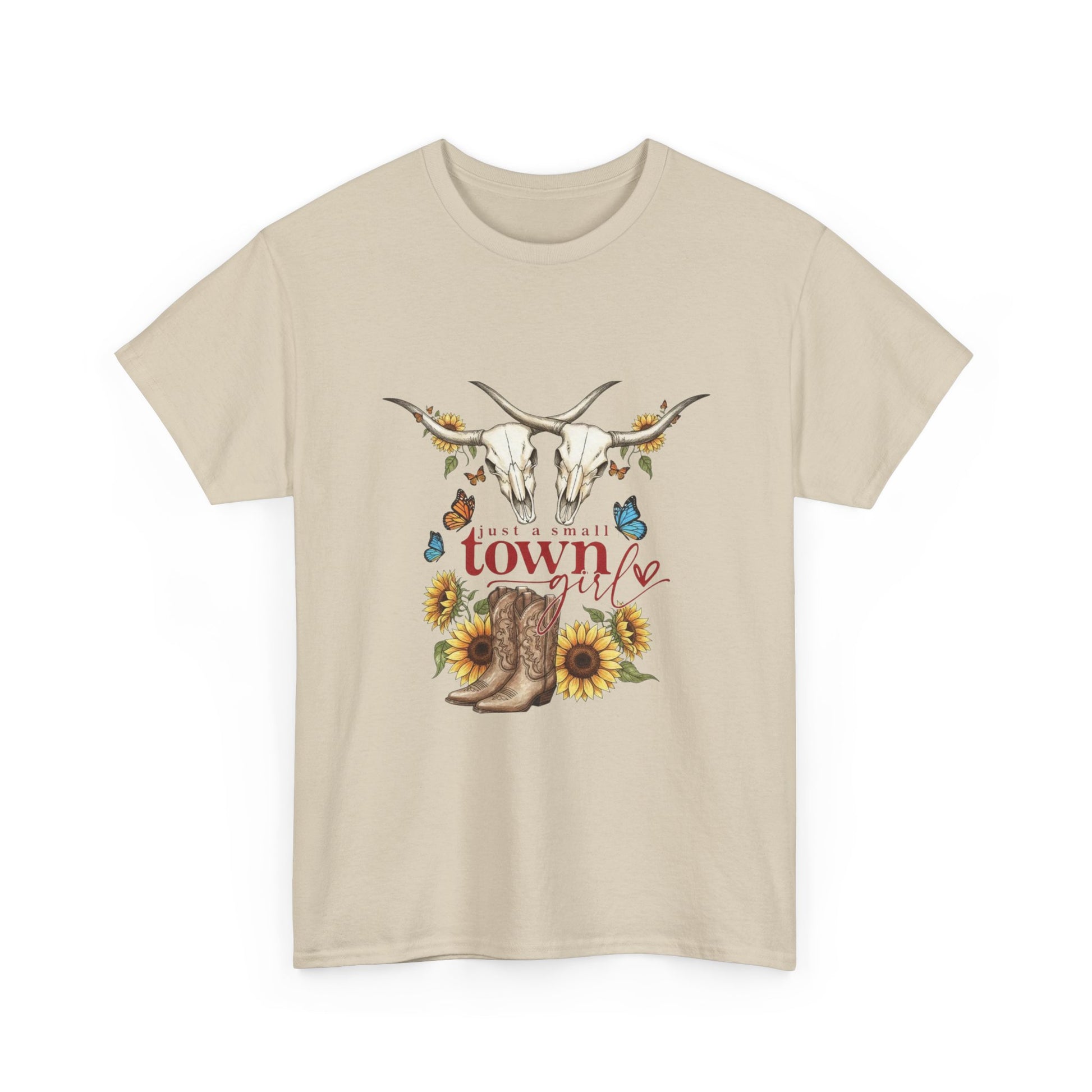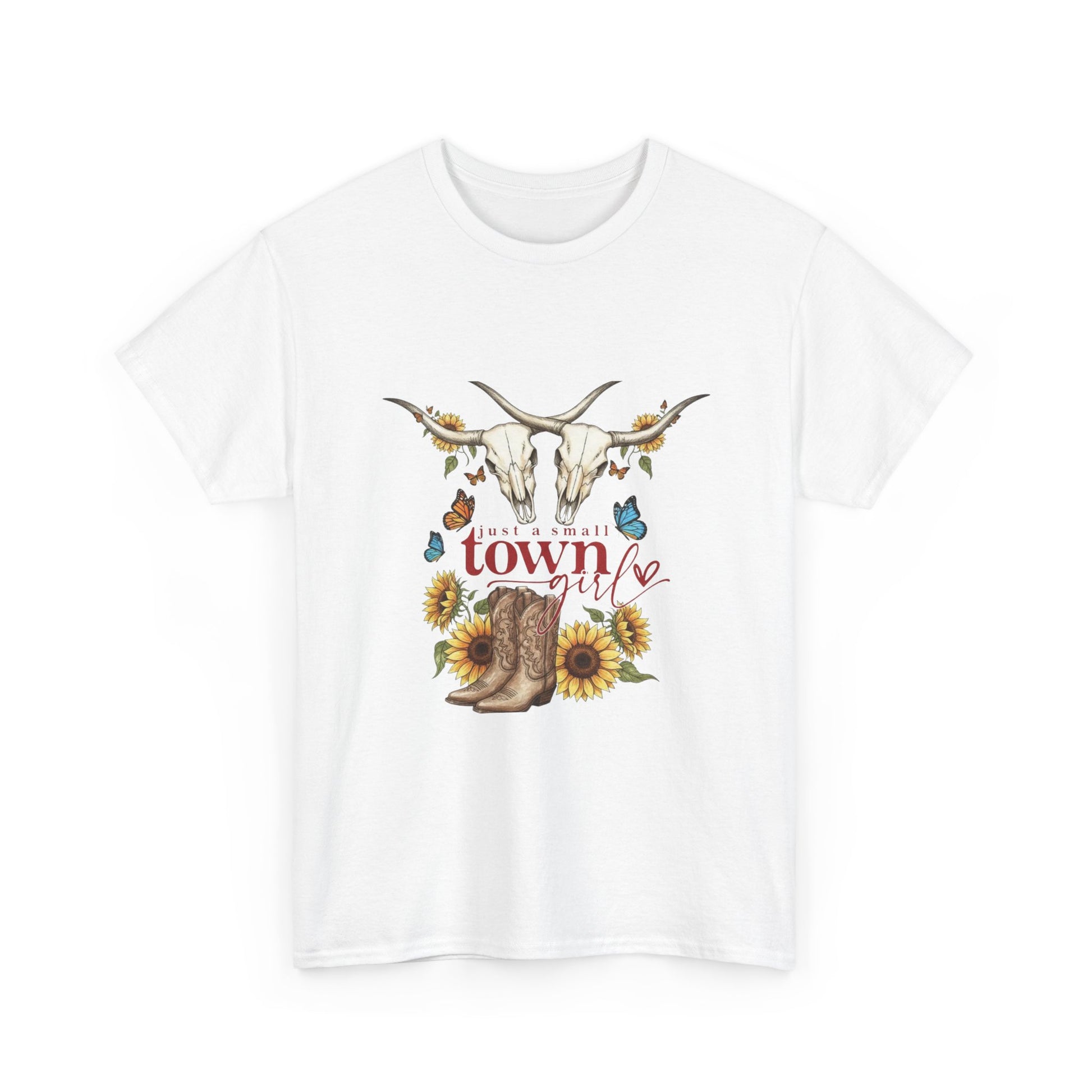 A soft, breathable tee that carries a warm, country-heart vibe. The front features a hand-drawn composition — a longhorn skull, worn cowboy boots, sunflowers, butterflies and small rustic accents — centered around the word “town.” It feels like a slow afternoon on a backroad: dusty light, late-summer sunflowers, and the quiet confidence of someone who loves the land. Wear it with faded jeans and a well-loved hat for strolls through farmers’ markets, backyard barbecues, or casual nights at the local honky-tonk. The print’s fine detail stays crisp thanks to high-quality DTG/DTF techniques, and the neutral white base lets the warm artwork pop without shouting.