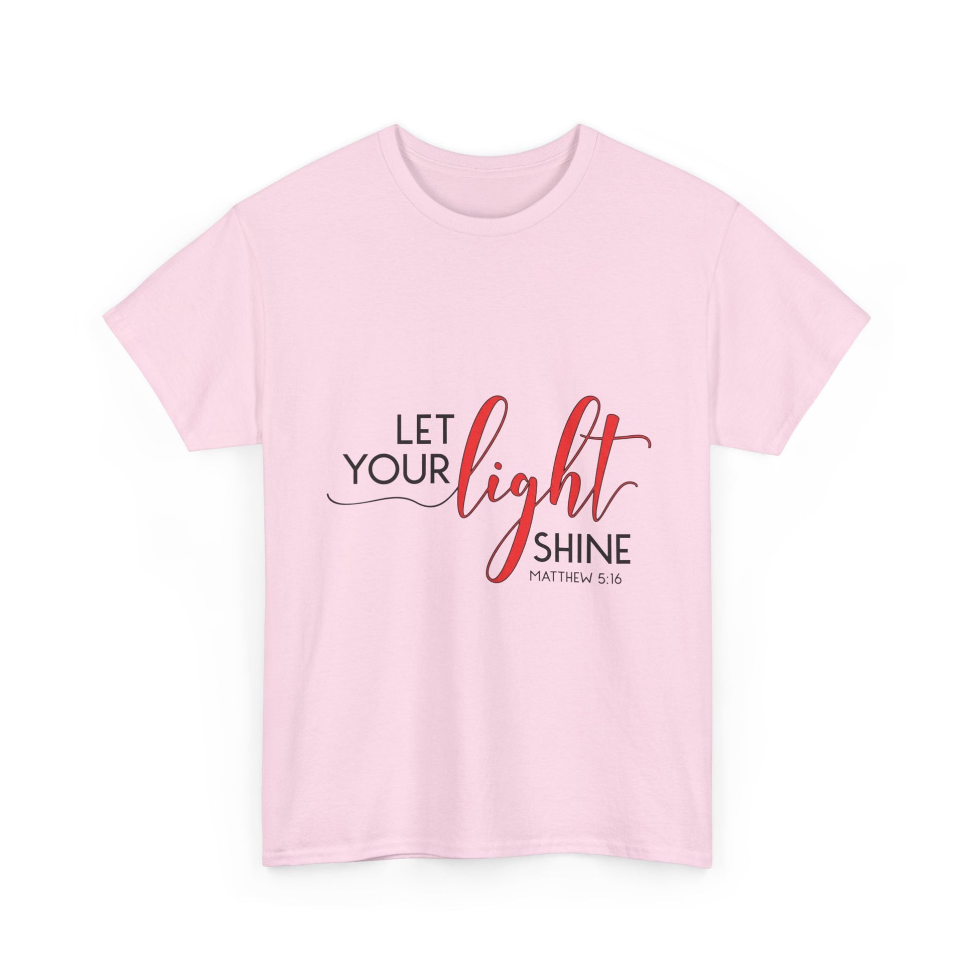 Soft, everyday tee that carries a quiet, hopeful message. The white crewneck features a graceful hand-lettered design reading “Let your light shine” with a subtle scripture reference beneath. Lightweight yet sturdy cotton holds the print crisply while the classic fit and tear-away label keep it comfortable from morning coffee to community gatherings. It layers easily under jackets or over shirts and becomes a gentle reminder to live openly, encourage others, and carry faith into regular days and small celebrations.