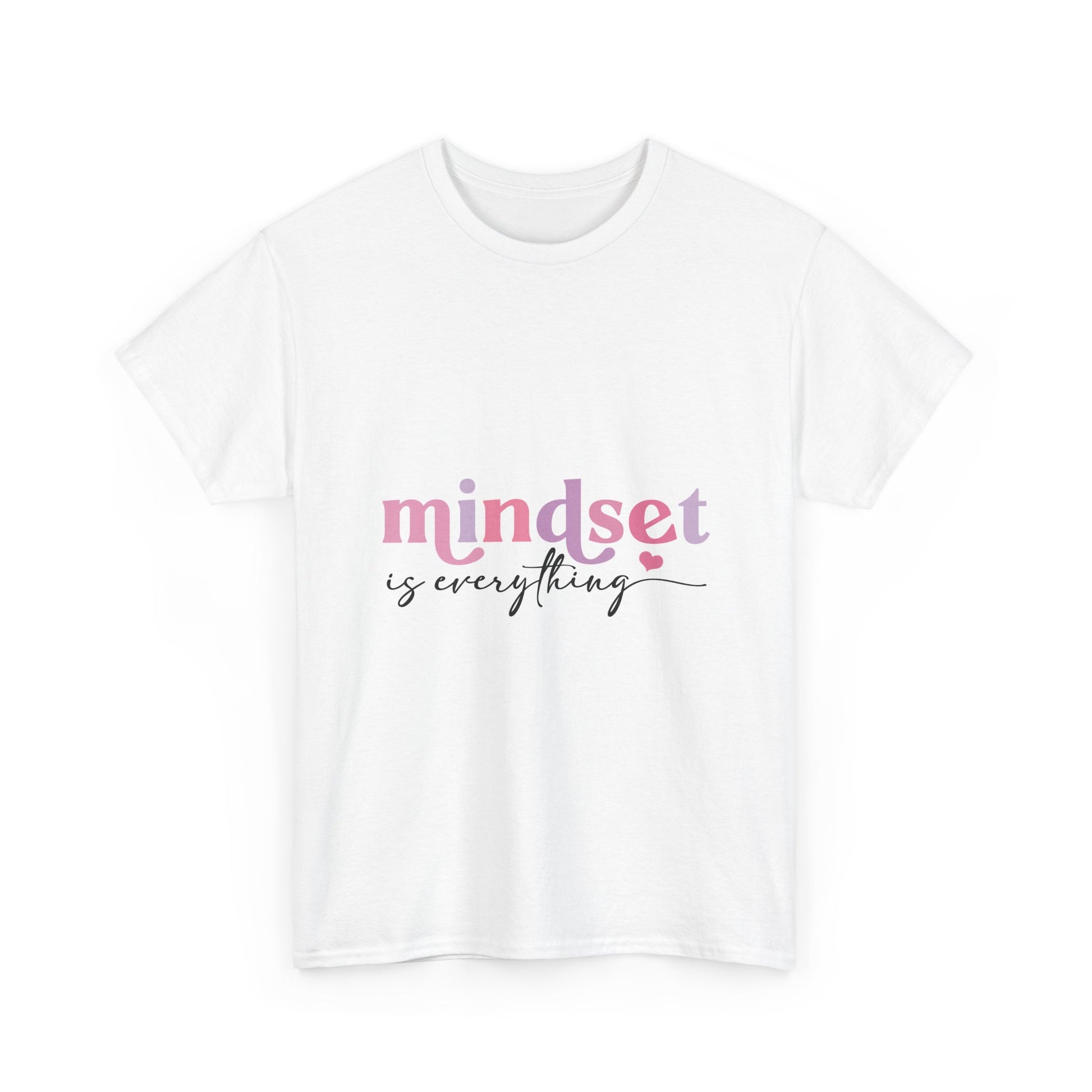 A soft, everyday tee that quietly carries a gentle reminder: mindset matters. The clean white cotton puts the pink and charcoal script front-and-center — ‘mindset’ in warm, feminine pink and ‘is everything’ in flowing charcoal handwriting. Wear it on slow mornings with a mug of coffee, on walks where you need a little boost, or layered under a cardigan for a casual meeting. The classic crew neck and relaxed fit let the message feel calm, confident, and effortless rather than loud. This is a comfortable canvas for someone who values small rituals of positivity and wants a subtle, uplifting piece in their wardrobe.