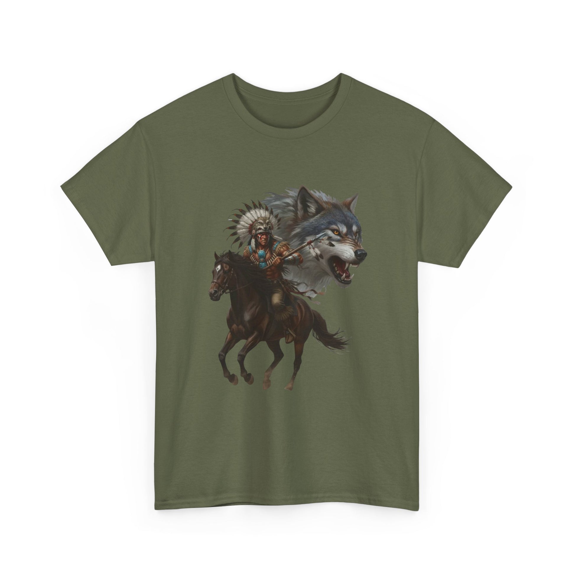 A short-sleeve cotton tee that carries a quiet, wild spirit. The front print pairs a charging horse and a wolf’s head with a feathered headdress, giving the shirt a storytelling vibe — like a fleeting moment on a long trail or a campfire tale shared under a wide sky. The fabric feels sturdy yet breathable; the classic crew neck and relaxed fit let the design do the talking while staying comfortable all day. Wear it layered on cool evenings or alone when you want an outfit that speaks to adventure and quiet resilience.