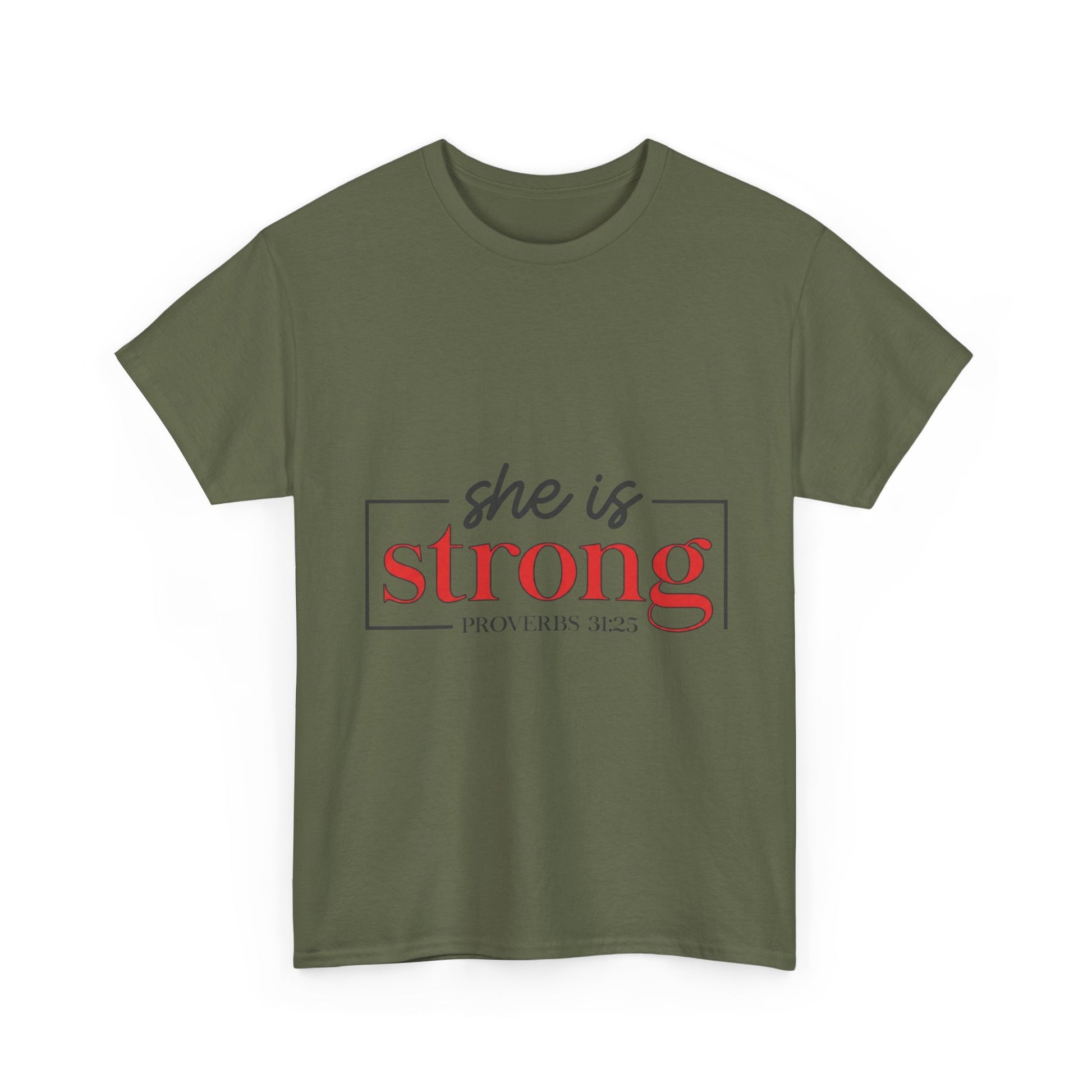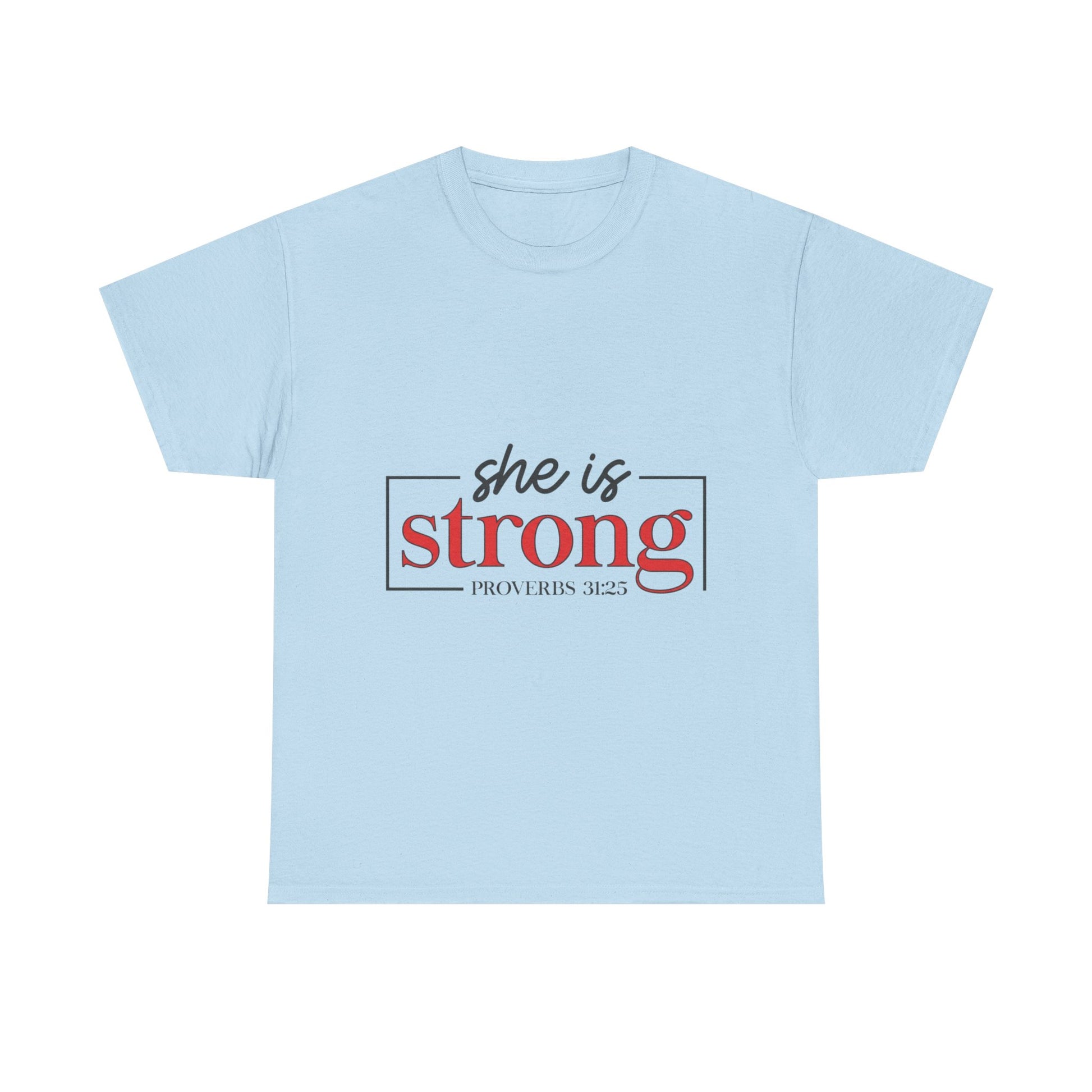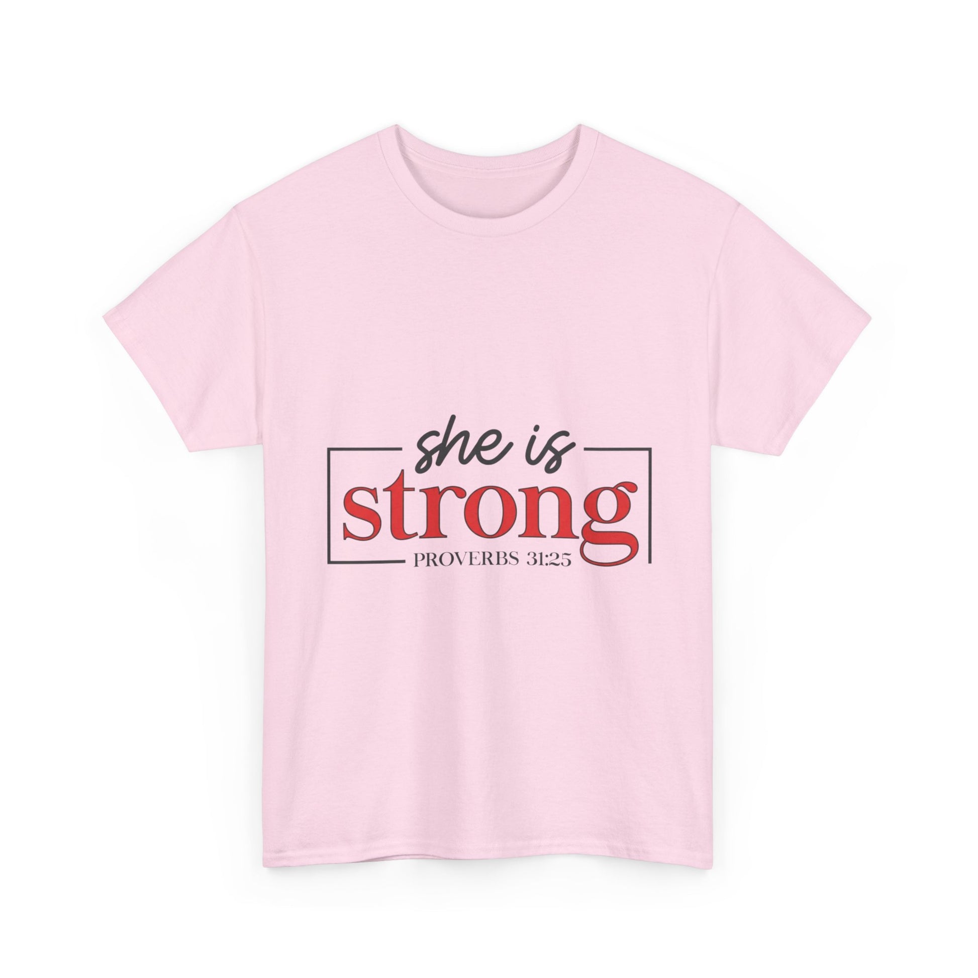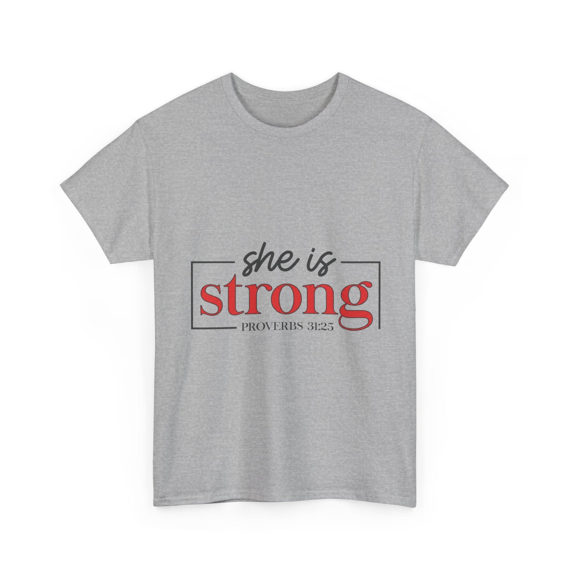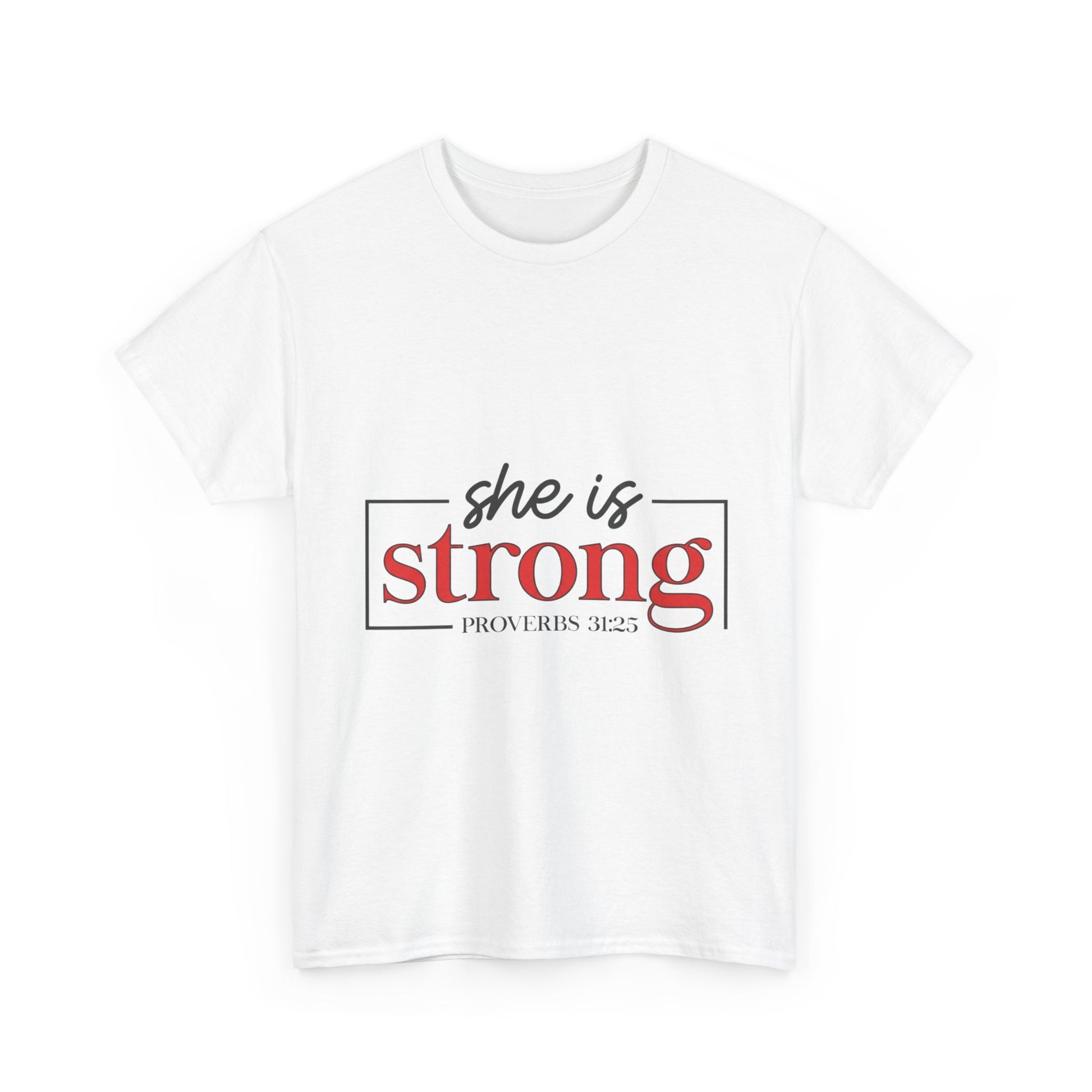 Lightweight, sturdy, and quietly confident — this classic tee carries a simple statement with gentle strength. The clean design reads “she is strong” in a refined two-tone typeblock, framed by a slim rectangular line that gives it a modern, editorial feel. Wear it to morning coffee, volunteer shifts, or low-key meetups where subtle meaning matters more than loud logos. The breathable mid-weight cotton and smooth print let the message sit naturally against the fabric, so the wearer’s calm conviction does the talking.