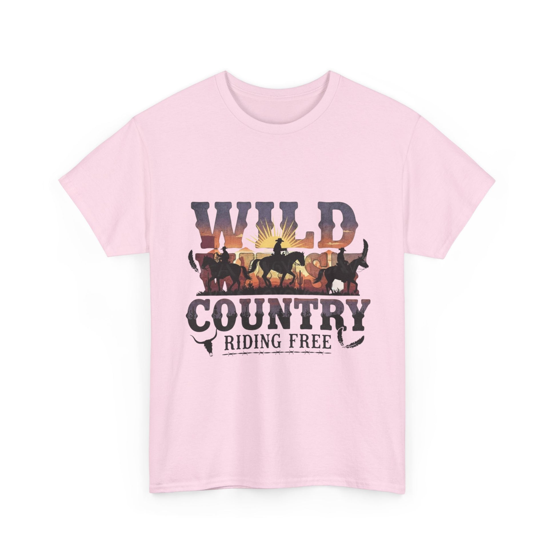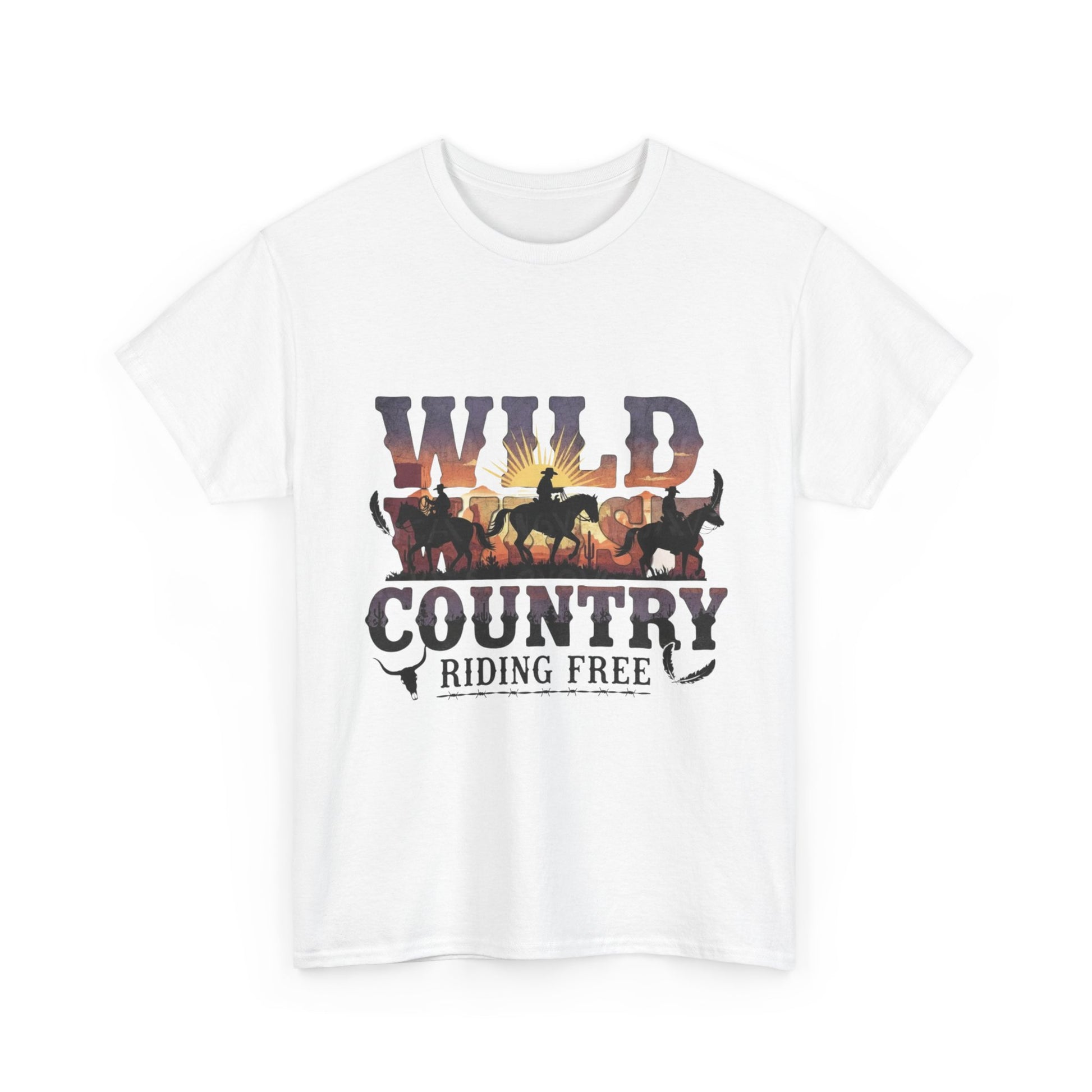 This soft, sturdy tee carries the spirit of wide-open roads and dusty trails. The front print layers bold block letters with a sunset-and-silhouette scene of riders and horses — a quiet, sun-warmed moment captured mid-ride. Wear it on mornings when you want to slow down, throw a saddle on the day, and feel connected to open fields and honest work. The relaxed crew neck and classic fit let the graphic speak without fuss, while the medium-weight cotton holds its shape ride after ride. It pairs naturally with worn denim, leather boots, and an easygoing attitude — for those who live for late afternoons at the stables, backroads at dusk, or weekend meetups at the local ranch.