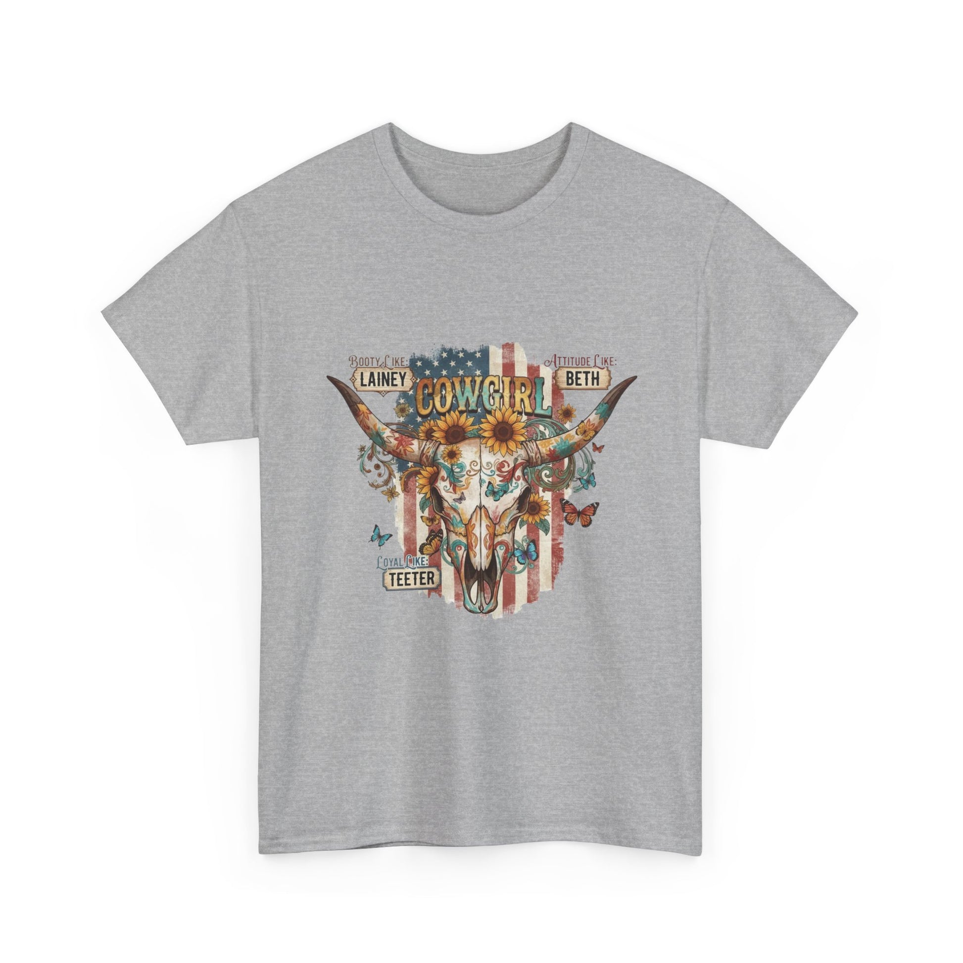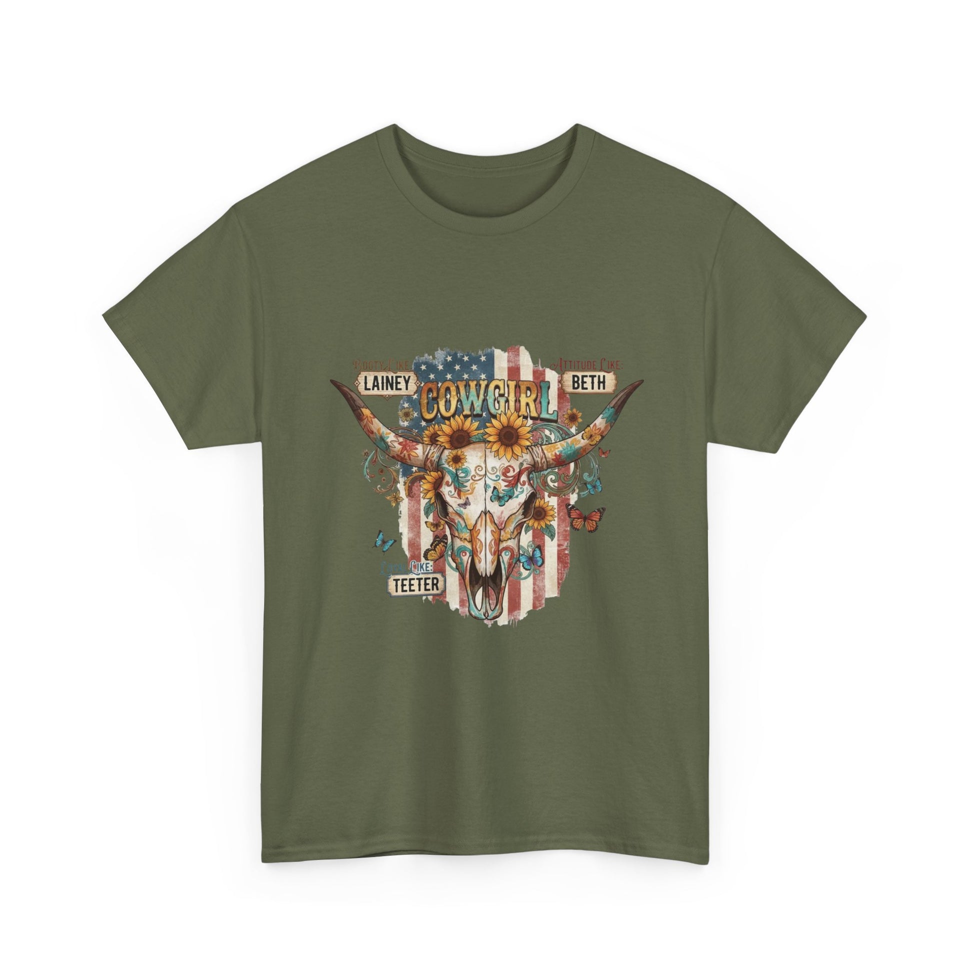 This classic crew-neck tee wears like a well-traveled companion. A bold southwestern skull illustration—layered with sunflowers, rustic Americana accents, and muted desert tones—sits at the chest, bringing relaxed country energy without shouting. The medium-weight cotton holds printed details crisply and drapes with a comfortable, boxy silhouette that works layered under a denim jacket or worn solo on warm evenings. It’s breathable, durable, and built to stay true through many washes, carrying the feel of open roads, festival nights, and slow afternoons on the porch.